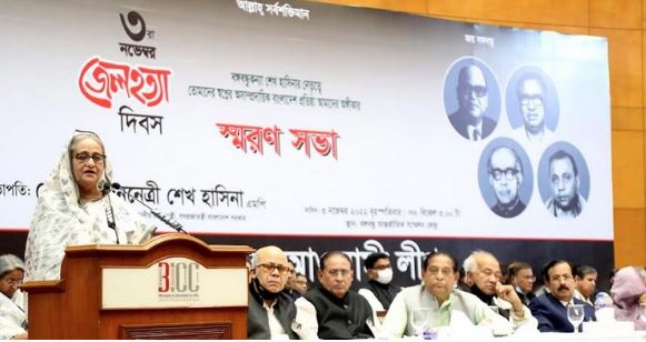 বৃহস্পতিবার (৩ নভেম্বর) ‘জেলহত্যা দিবস’ উপলক্ষে আয়োজিত স্মরণসভায় সভাপতির বক্তব্যে তিনি এ কথা বলেন। রাজধানীর বঙ্গবন্ধু আন্তর্জাতিক সম্মেলন কেন্দ্রে বাংলাদেশ আওয়ামী লীগ এ স্মরণসভার আয়োজন করে।