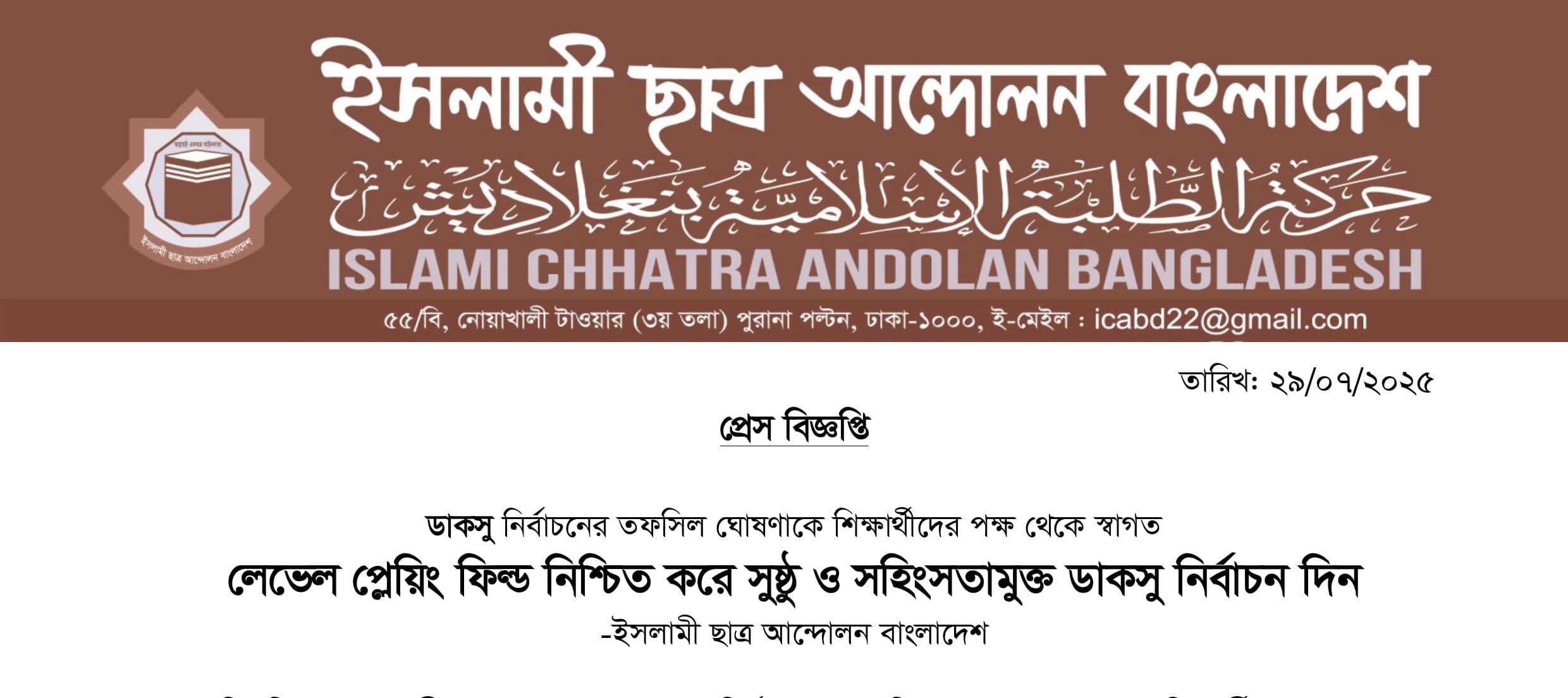 নেতৃদ্বয় আরও বলেন, ছাত্ররাজনীতি জাতীয় নেতৃত্ব গঠনের সূতিকাগার। তাই ডাকসু নির্বাচন কমিশন, ঢাকা বিশ্ববিদ্যালয় প্রশাসন এবং সংশ্লিষ্ট সকলকে রাজনৈতিক পক্ষপাত থেকে দূরে থেকে একটি সহিংসতামুক্ত ও শান্তিপূর্ণ নির্বাচন পরিবেশ নিশ্চিত করতে হবে। একইসঙ্গে সকল ছাত্রসংগঠনের প্রতি আহ্বান জানাই, তারা যেন দায়িত্বশীল আচরণ করে এবং একটি ইতিবাচক সহাবস্থান ও অংশগ্রহণমূলক ছাত্র রাজনীতি চর্চার সংস্কৃতি গড়ে তুলতে ভূমিকা পালন করে।