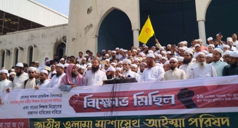 দেশের সকল সরকারি প্রাথমিক বিদ্যালয়ে বাধ্যতামূলক ধর্মীয় শিক্ষক নিয়োগ ও গানের শিক্ষক নিয়োগের প্রজ্ঞাপন বাতিলের দাবিতে রাজধানীতে বিক্ষোভ করেছেন ওলামা মাশায়েখরা। আজ শুক্রবার (১৯ সেপ্টেম্বর) জুমার নামাজ শেষে জাতীয় মসজিদ বায়তুল মোকাররম থেকে জাতীয় ওলামা মাশায়েখ আইম্মা পরিষদের ব্যানারে তারা বিক্ষোভ মিছিল করেন।