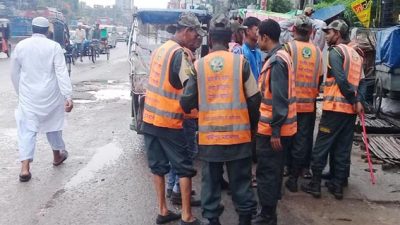 মেয়র প্রার্থীর ফাউন্ডেশনের ব্যাজ ধারণ করে ‘ট্রাফিক সহকারীরা’ নির্বাচনী প্রচারণায়!